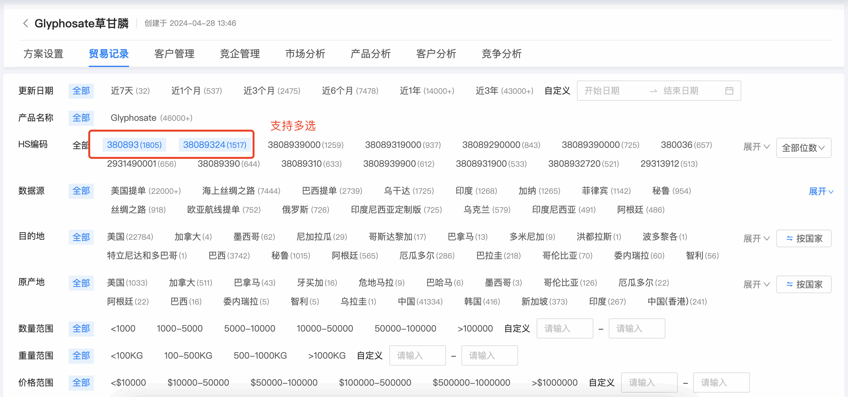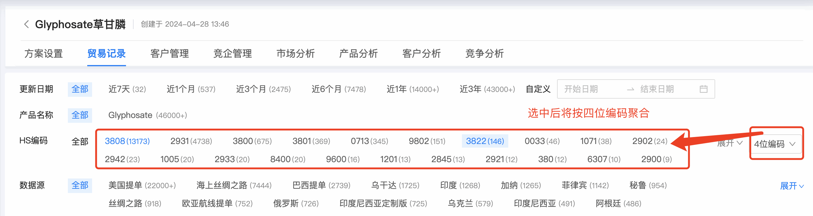 1. PA真人国际数据通贸易记录的编码筛选,支持按 4 位、 6 位编码位数统计,同时可支持多选。