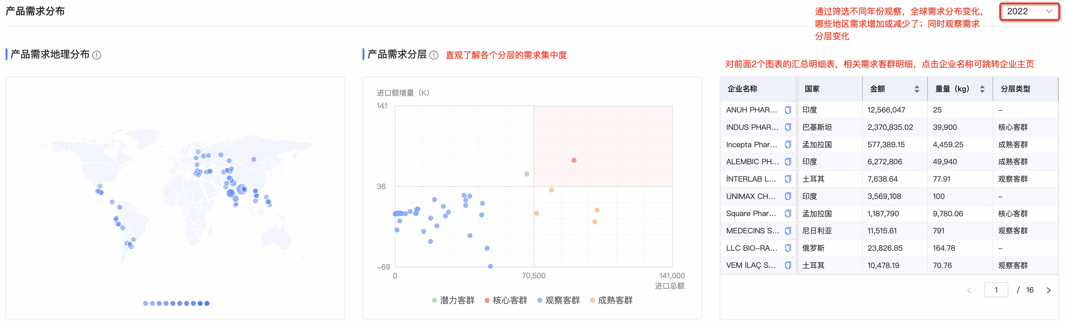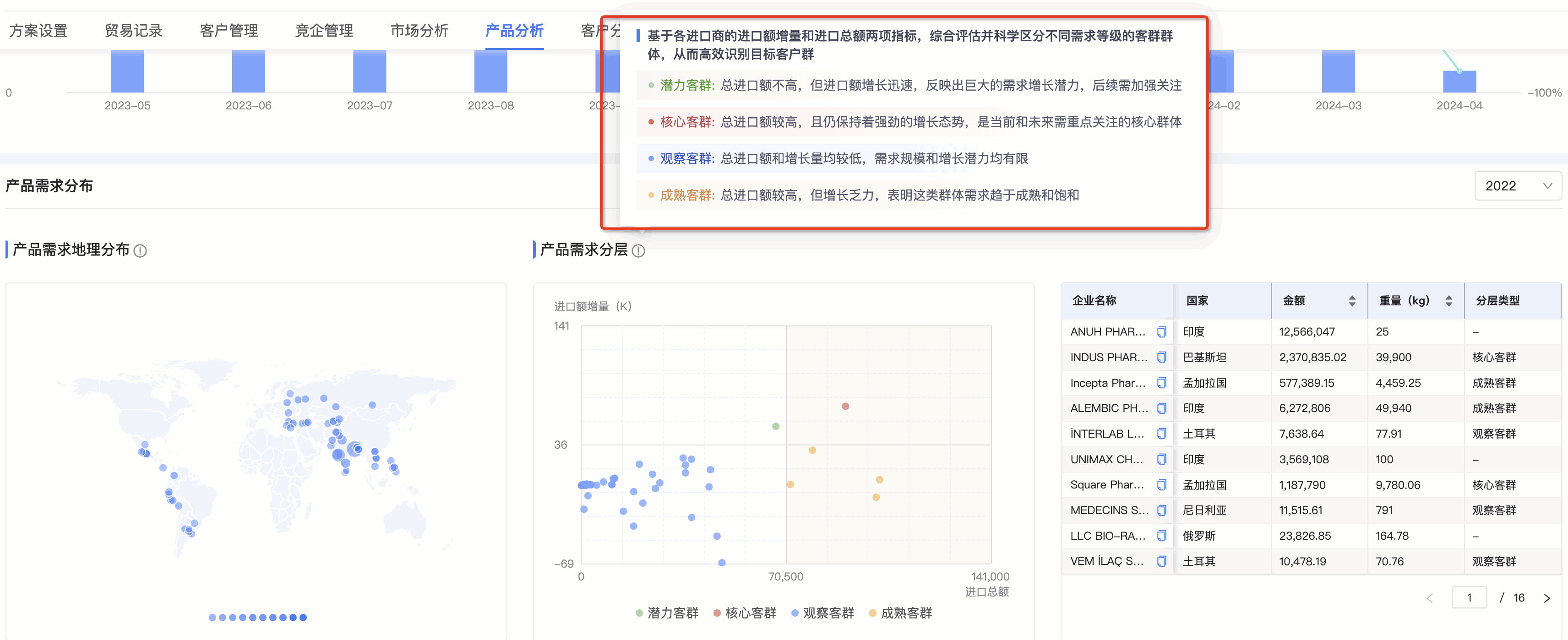 ● 产品需求分层图:PA真人国际数据通将需求客群按照进口额增量和总额进行分层,划分为潜力、观察、成熟和核心四个层级。分层有助于用户快速锁定目标客户群体。标题旁附需求分层的解读,能让用户更直观、快速理解每个层级的特征,能够更快速的识别目标客群。