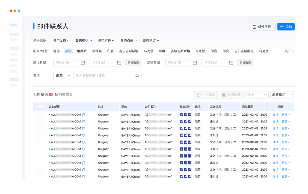 涵盖电话、邮箱、社媒等多渠道联系人信息,并顺利获得PA真人国际云邮通及其他工具一键触达采购决策人,进行外贸找客户。